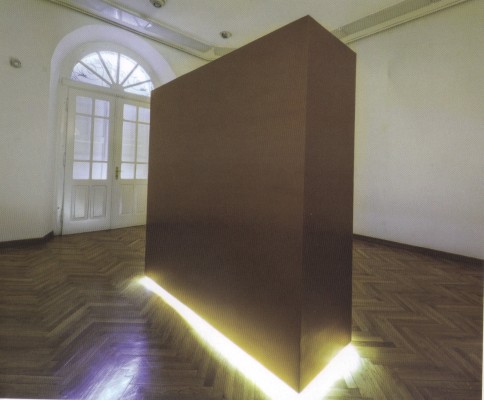 Tako se i Peko, nije morao zamarati sa laserom koga je, kao „neopipljivi“ izvor svjetla „relativne forme“ svakako morao unijeti u „apsolutnu formu praznog galerijskog prostora“ jer slične stvari čini fosfor i bez baterija, pa je na izložbi svoje mračne komore mogao unijeti i saobraćajne znake, „mačije oči“ sa automobila, i druge fluoriscentne predmete, sa kojima bi kao vajar napravio neku zanimljivu kreaciju sa optički „relativnim formama“. Slikar Vesko Gagović se predstavio sa većom uspravljenom plintom u obliku kvadra, pod nazivom „Lebdeći objekat“. Ona je izdižena od poda u debljini običnih cigli, na koje je vjerovatno i postavljena i postavljena na sredini posebno zamračene prostorije, čime je usiljeno stekla i veću bizarnu „važnost“. Ispod kvadra su sitna svjetla, koju automobilska industrija sve više koristi, a koja svjetlosno razdvajaju zapreminu kvadra od poda, tako da daje utisak da nezgrapni predmet lebdi. (Povećanjem svjetla on bi, vjerovatno, odavao utisak da je i na „raketni pogon“.) Tipičan scenski aranžman modernog enterijera, sa difuznim osvjetljenjem. Ali i neka đeca odavno nose kičerske patike sa svjetiljkama u đonu patika. Ova difuzna scenska svjetlost uvijek je imala široku dekorativnu primjenu u šou biznisu, TV scenografiji studija, izloga, metalnog stepeništa, duplih plafonskih aranžmana. Ali i šankova, na šta potsjeća ova Gagovićeva kutija. Plinta je obojena siliakatnom „metalik“ bojom, u nijansi starog zlata. Nataša u katalogu i ovaj rad povezuje sa nekim video zapisom Turela. Pa kao u nekoj nebulozi kaže: „ Veliki trodimenzionalni pravougaonik umjetnik prekriva zlatnom bojom iz čije unutrašnjosti zrači neonska svjetlost čineći da se poput Turelove kocke dematerijalizuje.“ Dakle, osoba koja ne zna nazive ni osnovnih geometrijskih oblika objašnjava dematerijalizaciju, da se pitam da li je i viđela izloženi rad, potpuno zatvoren kvadar, poput plinte. A objekat koji lebdi nije dematerijalizovan. (Kako bi se tek osjećali astronauti u vasionskom brodu da je tako, kada u kapsuli bukvalno sve lebdi, pa i kapi vode.)