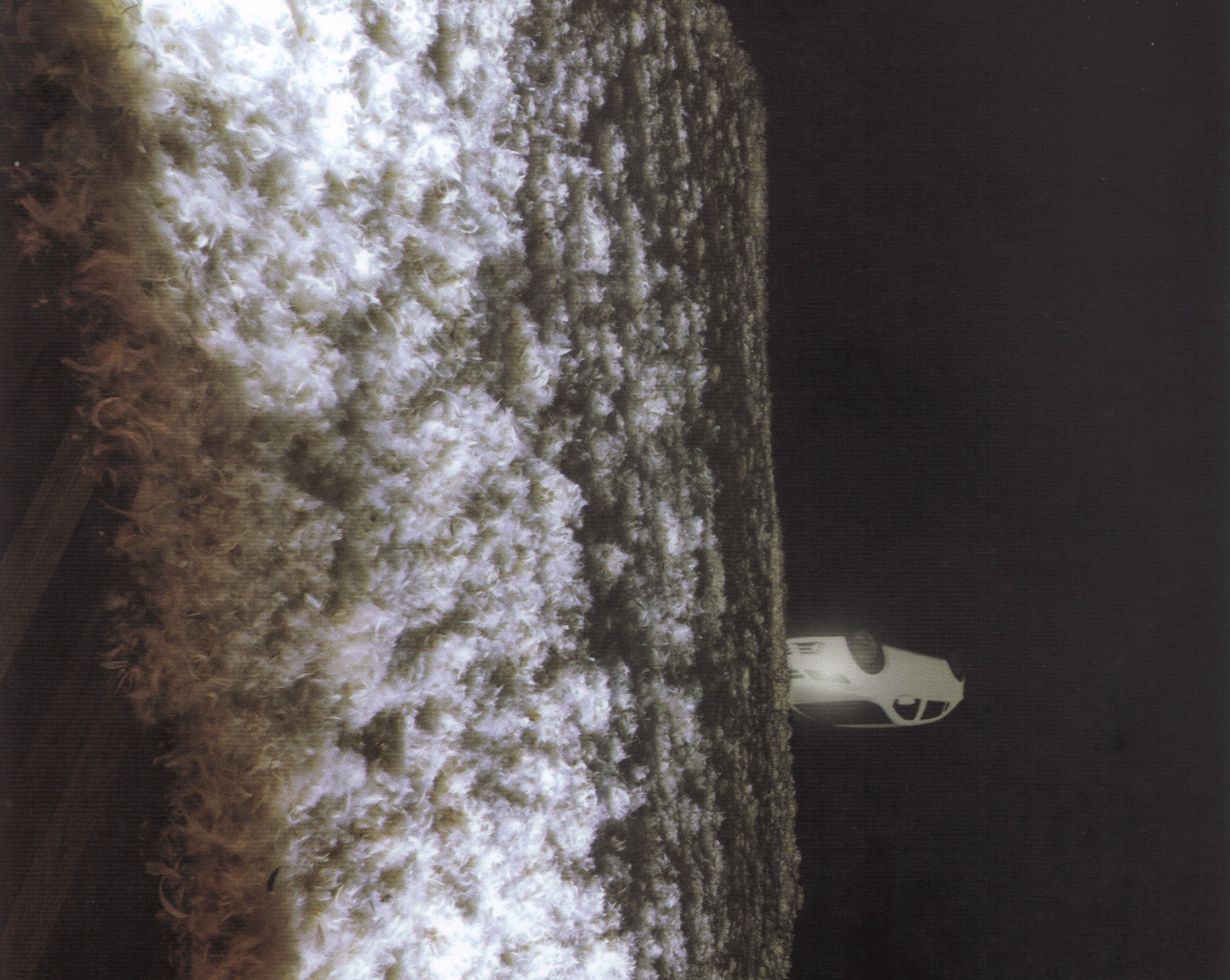 Dakle, opet zamjena teza. U instalaciji je samo autorka na fotografiji, a ostalo je projekcija video zapisa. Glupave analogije nijesu baš toliko naivne kako izgledaju na prvi pogled već služe za zamjenu teza namijenjenim ograničenom i neobrazovanom svijetu. Siniša Radulović, službenik ove ustanove, se takođe predstavio multimedijalnim aranžmanom: sa video-bim projekcijom automobila u kretanju i razbacanim perjem po podu cijelog jednog zamračenog izložbenog odjeljka. Bijeli automobil, sa ukljućenim farovima, se sporo kreće po mraku niz strminu i propada u pod prekriven perjem. Emotivnu nezrelost koja zaokuplja cjelokupan dojam Nataša u katalogu pojašnjava: „Važan segment rada je pod na kojem je rasuto perje koje iz daljine izgleda kao oblak.“ Kao da se unutrašnjost sobe može gledati iz daljine i kao da je nešto tako normalna pojava u sobi i van nje, da automobili padaju u oblak, kao što avioni prolaze kroz njih. Dakle ovaj teški kič infatilnog porijekla je zapravo nebeski paperjastog porijekl i time je trebalo da objasni tragediju na putu koja je „metafizički“ transformisana u vječnost, kao što naglašava naziv. Ime ovog djela je „Uroboros“.