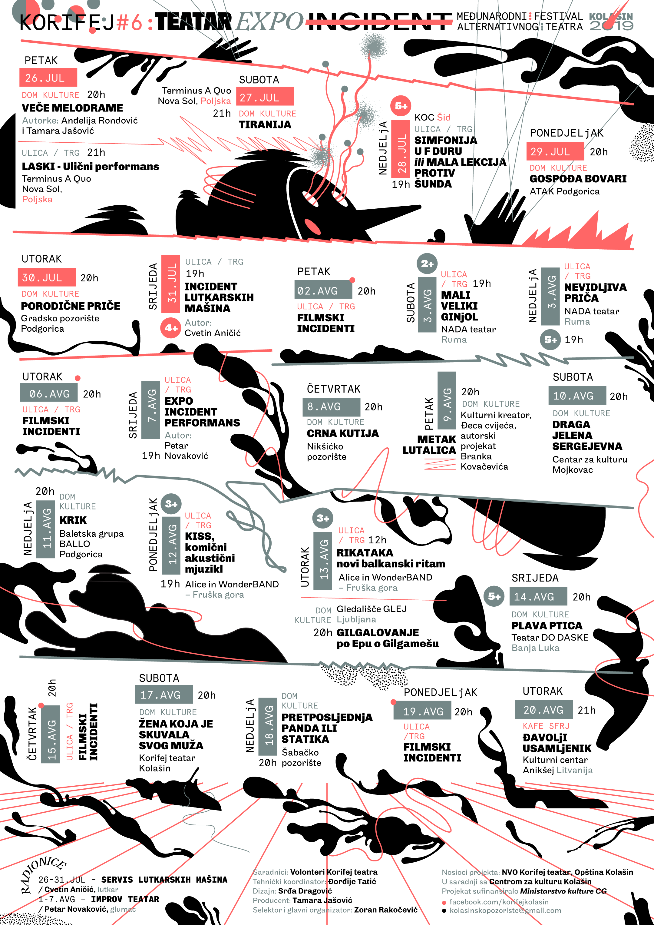 “S ponosom objavljuejmo da će se 6. Međunarodni festival alternativnog teatra Korifej održati u Kolašinu u periodu od 26.jula do 20.avgusta 2019.godine, u organizaciji Opštine Kolašin i NVO “Korifej teatar” iz Kolašina. Festival pod sloganom “Teatar Expo Incident” nastavlja ideju prethodnih izdanja festivala koji su nosili gesla Živa ulica, odnosno Otvorena varoš, imajući za cilj razvoj pozorišne umjetnosti u Kolašinu, te poboljšanje kulturne ponude Crne Gore, naročito sjevera.