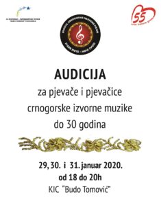 Kulturno – informativni centar „Budo Tomović“ raspisuje audiciju za učesnike III izdanja Festivala crnogorske narodne pjesme „Stare note – novi zvuci“ koji će biti održan 26. marta u Velikoj sali KIC-a.