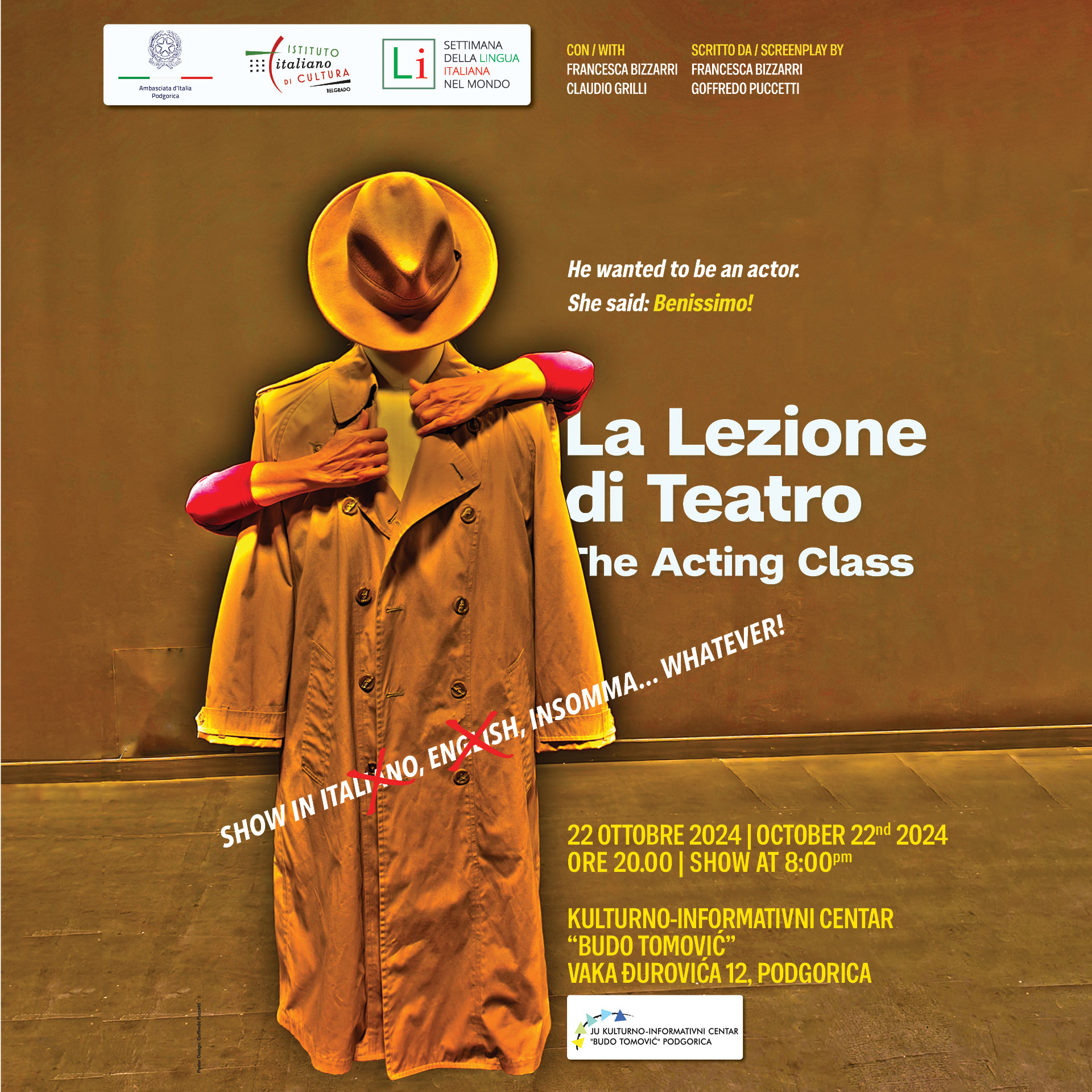 Ambasada Italije u Podgorici i Italijanski institut za kulturu u Beogradu organizuju u okviru XXIV Neđelje italijanskog jezika u svijetu, predstavu „Čas glume“ Frančeske Bicari i Gofreda Pučetija.