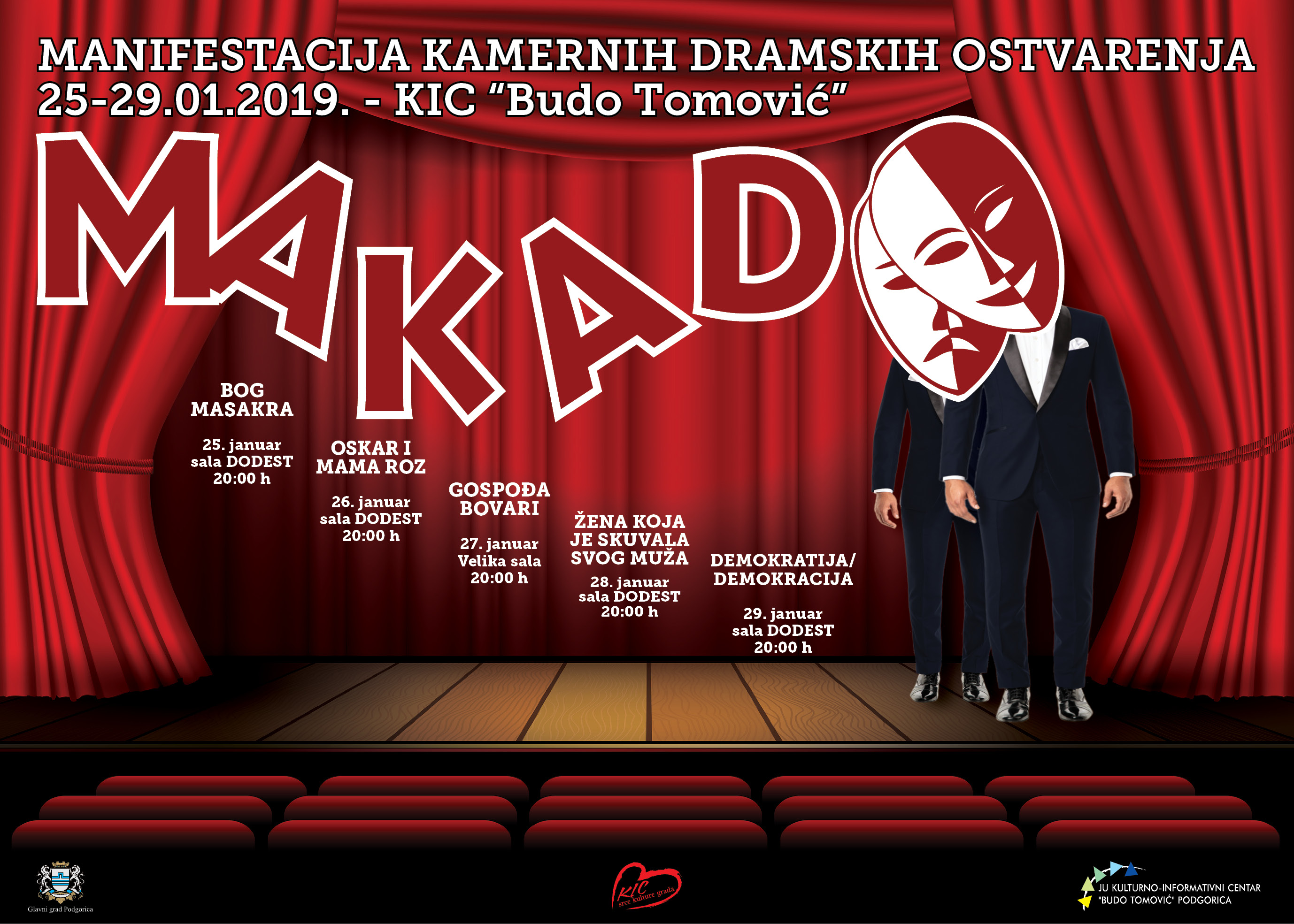 Četvrtu Manifestaciju kamernih dramskih ostvarenja – MAKADO čiji cilj je afirmacija pozorišne kulture organizovaćemo u okviru dramskog programa KIC-a “Budo Tomović” od 25. do 29.januara. Predstavićemo pet aktuelnih domaćih i gostujućih produkcija i koprodukcija u okviru manifestacije koja iz godine u godinu sve više plijeni pažnju šire javnosti zbog dobre selekcije predstava, žanrovske raznovrsnosti i ekskluziviteta u premijernim izvođenjima. Četvrti MAKADO će podgoričkoj publici premjerno predstaviti mobilne dramske forme iz: Beograda, Sarajeva, Kolašina, Cetinja i Plužina.