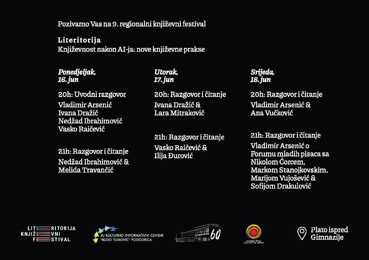 Kulturno-informativni centar „Budo Tomović“ organizuje deveto izdanje regionalnog književnog festivala „LiTeritorija“ od 16. do 18. juna 2025. godine na platou Gimnazije „Slobodan Škerović”, sa početkom u 20 sati. Festival je prepoznat kao važna platforma za predstavljanje autora iz zemalja bivše Jugoslavije i promovisanje novih književnih praksi, postavši, tokom godina, jedno od bitnih mjesta susreta savremenih pisaca, kritičara i čitalaca.