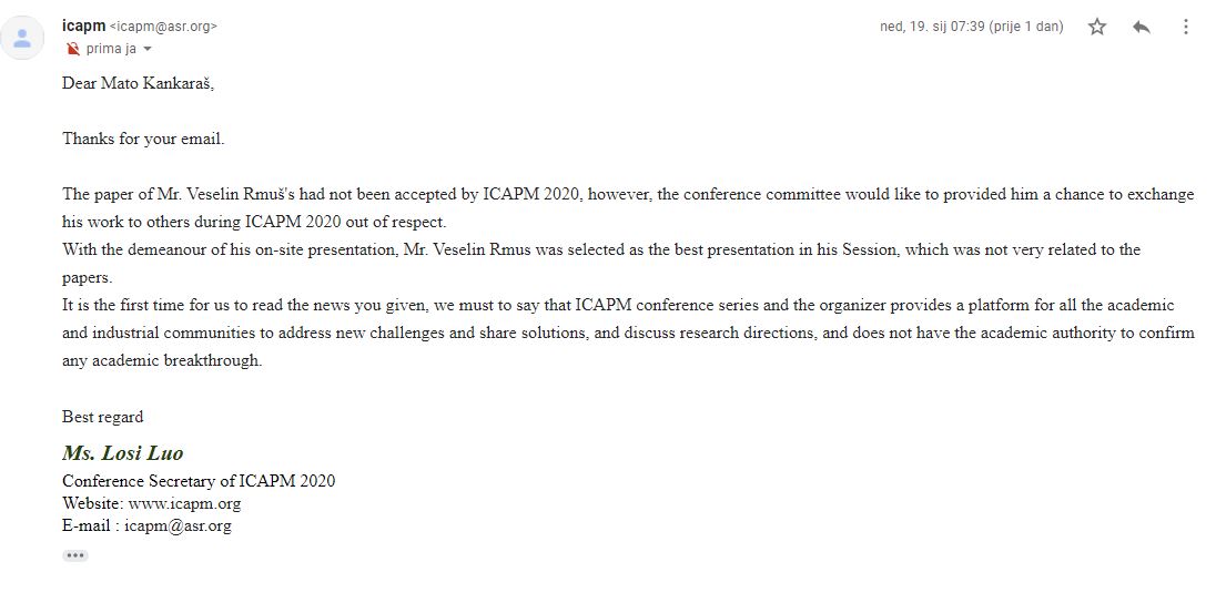 Pomenuta Međunarodna konferencija u Tokiju nije okupljanje koje u naučnim krugovima ima ikakvu težinu. Kako se vidi iz pisma koje smo od njih dobili – nemaju akademski autoritet da potvrde nečiji proboj u akademskim vodama. Evo prevoda pisma i prikaza izvornog odgovora: