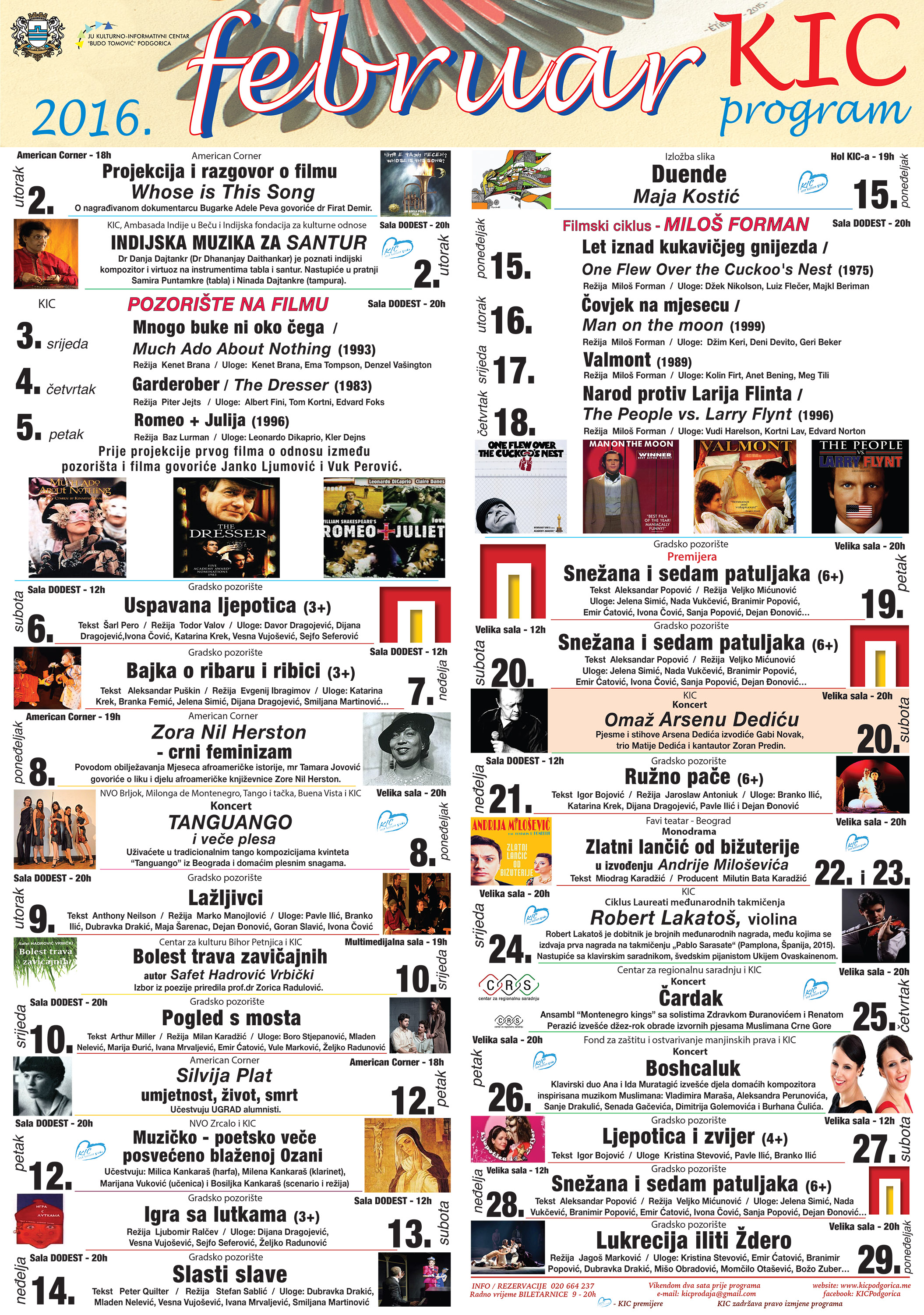 Filmski repertoar KIC-a od 3. do 5.februara obilježiće revija posvećena poznatim ekranizovanim pozorišnim komadima (Mnogo buke ni oko čega 1993, Garderober 1983, Romeo + Julija 1996), a od 15. do 18.februara predstavićemo filmove proslavljenog češkog reditelja Miloša Formana (Let iznad kukavičjeg gnijezda 1975, Čovjek na mjesecu 1999, Valmont 1989, Narod protiv Larija Flinta 1996).