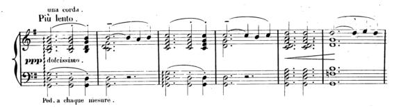 U Godinama hodočašća (Druga godina: Italija) Liszt je pokazao široku paletu raznih vrsta arpeggia. Arpeggia iz komada Spozalizio, se izvode u kombinaciji sa pedalom tako da pedal ”ostavlja” arpeggio da odzvuči i kao rezultat se postiže isto trajanje koje bi imao arpeggio izveden na harfi.