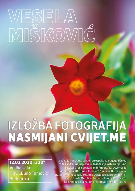 Retrospektiva dugogodišnjeg profesionalnog i umjetničkog djelovanja Vesele Mišković biće predstavljena kroz izložbu fotografija pod nazivom „Nasmijani cvijet.me, koja će biti otvorena neuobičajenim multimedijalnim performansom u Velikoj sali KIC-a u srijedu, 12.februara u 20 sati.