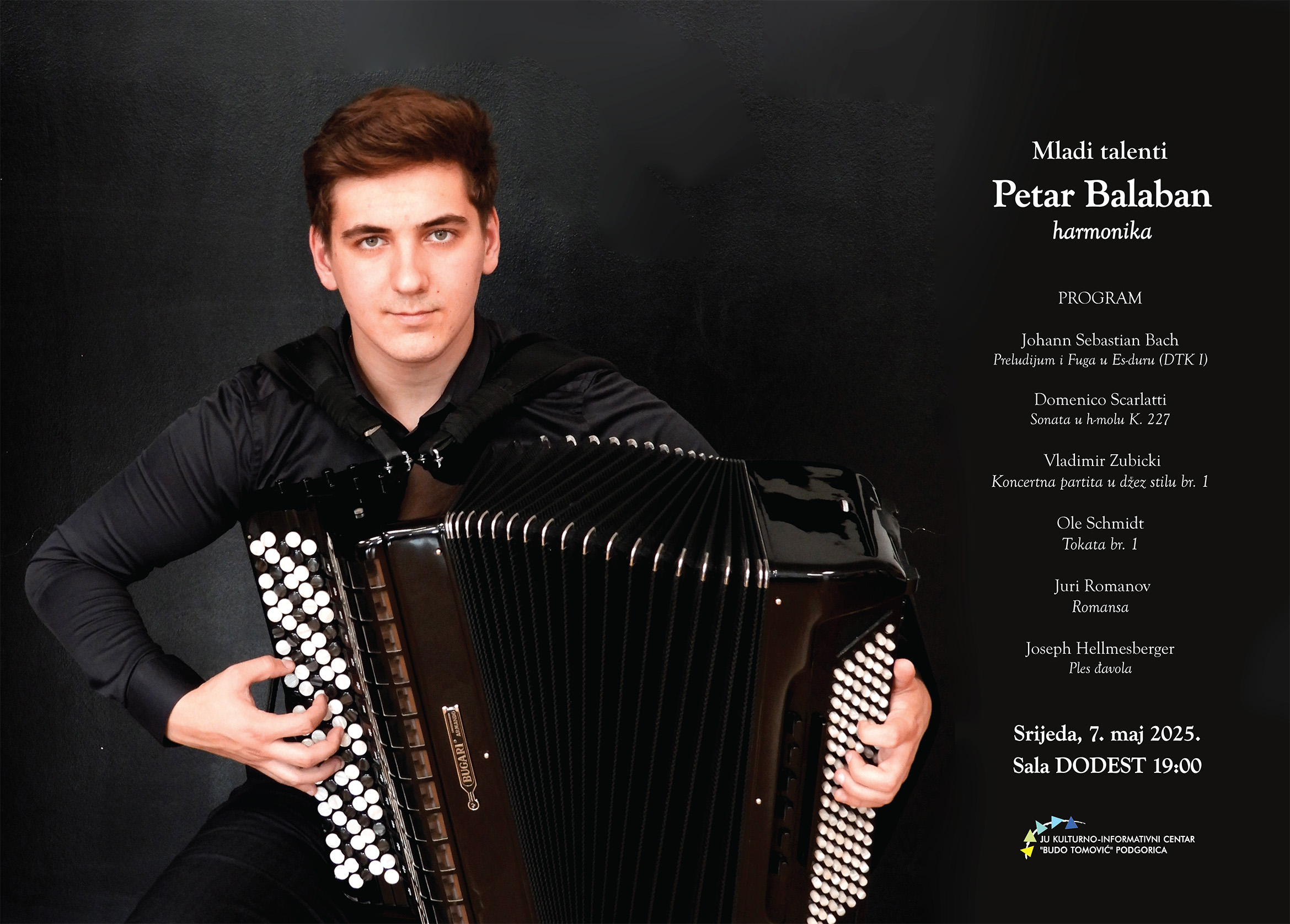 Koncert višestruko nagrađivanog soliste na harmonici Petra Balabana biće održan u okviru KIC-ovog ciklusa „Mladi talenti” u srijedu, 7. maja, u sali DODEST, u 19 sati.