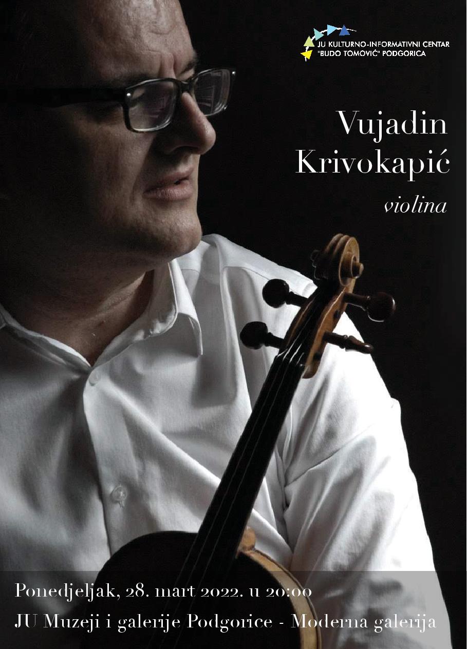Violinista Vujadin Krivokapić prirediće koncert za solo violinu u organizaciji KIC-a “Budo Tomović” u ponedjeljak, 28.marta, u Modernoj galeriji Muzeja i galerija Podgorice u 20 sati.