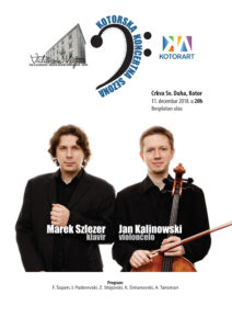 Koncertom dvojice vrsnih muzičara, violončeliste Jana Kalinovskog /Jan Kalinowski/ i pijaniste Mareka Šlezera /Marek Szlezer/, Kotorska Koncertna Sezona nastavlja niz koncerata koji su posvećeni violončelu. Koncert je zakazan za danas, 11.12.2018. u Crkvi sv. Duha, sa početkom u 20h. Ulaz, kao i za sve koncerte Koncertne Sezone je besplatan. Koncertnu sezonu združenim snagama organizuju Muzička škola „Vida Matjan“ i festival KotorArt Don Brankovi dani muzike.