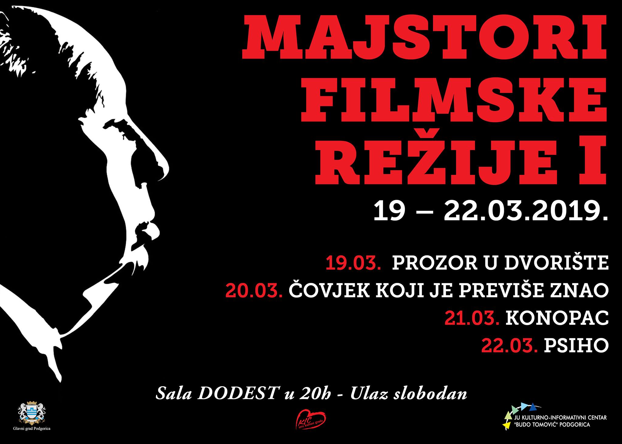Filmski program Kulturno – informativnog centra “Budo Tomović” ove godine između ostalog biće posvećen i najeminentnijim imenima filmske režije, pa će prvo izdanje revije “Majstori filmske režije” obilježiti najpoznatiji filmovi britanskog reditelja Alfreda Hičkoka.