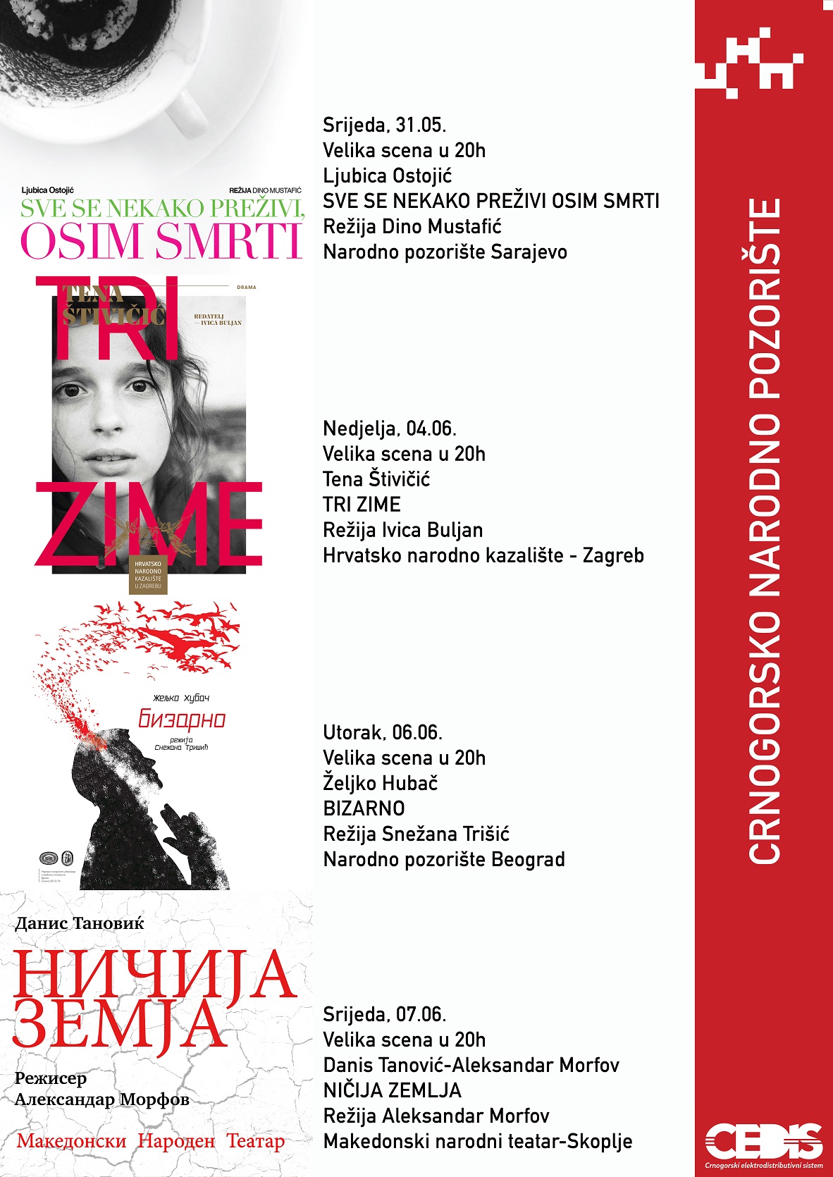 U sklopu obilježavanja jubileja – 20 godina od obnovljenog zdanja Crnogorskog narodnog pozorišta, od 31. maja do 7. juna biće izvedene predstave Narodnog pozorišta iz Sarajeva, Hrvatskog narodnog kazališta iz Zagreba, Narodnog pozorišta iz Beograda i Makedonskog narodnog teatra iz Skoplja.