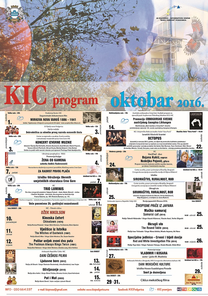 Likovni program KIC-a nastaviće saradnju sa srodnim institucijama koje se bave promocijom kulture i umjetnosti, pa ćemo 7.oktobra uživati u izložbi Udruženja likovnih umjetničkih stvaralaca Crne Gore. U saradnji sa Centrom za etiku, pravo i primenjenu filozofiju iz Beograda i Crnogorskom asocijacijom za američke studije dr Biljana Milatović organizovaćemo izložbu “Siromaštvo, ruralnost, rod” 25.oktobra, a u okviru manifestacije “Dani meksičke kulture” 29.oktobra predstaviće nam se i Hose Guadalupe Posada sa izložbom “Smrt je dozvoljena”. Kako su izgledali reklamni oglasi podgoričkih firmi u prvoj polovini XX vijeka koje je priredio autor Mitar Miranović saznaćemo 1.oktobra.