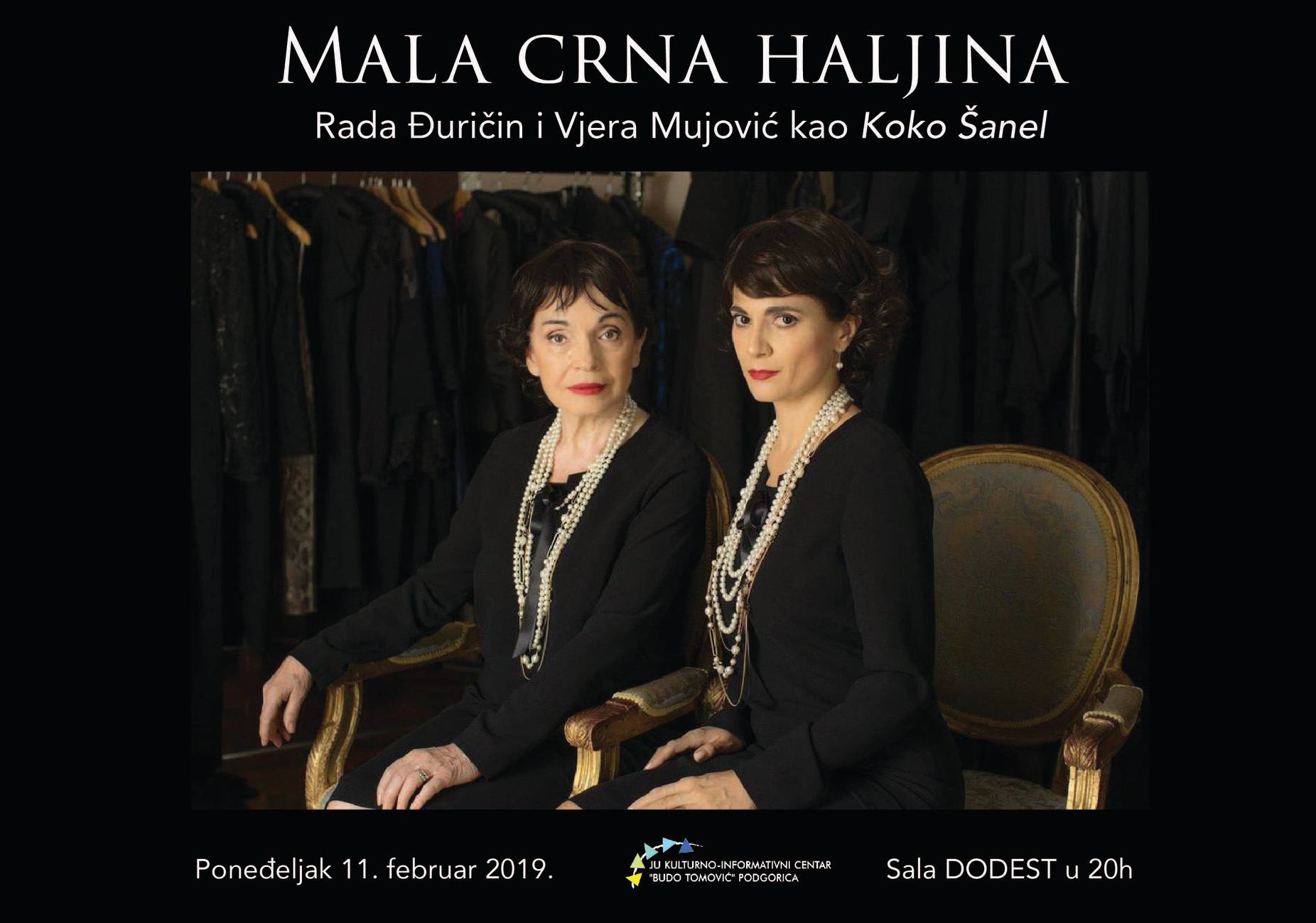 Podgoričku premijeru predstave “Mala crna haljina” koja je inspirisana životom slavne francuske kreatorke Koko Šanel organizovaćemo śutra, u poneđeljak, 11.februara u sali DODEST, sa početkom u 20 sati. Kroz život neponovljive Koko Šanel publiku će voditi istaknute beogradske glumice Rada Đuričin i Vjera Mujović. Autorka ove drame je Vjera Mujović, a režiju potpisuje Nataša Radulović.