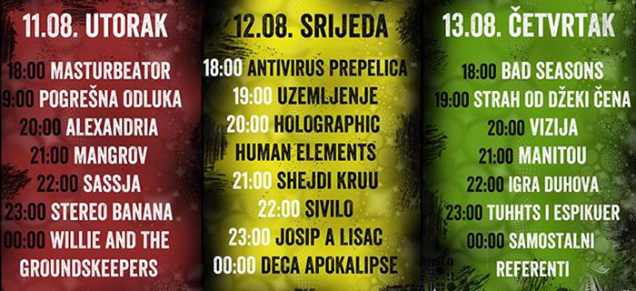 *spisak najavljenih bendova/izvođača: Masturbeator(Bar, Crna Gora), Pogrešna odluka(Beograd, Srbija), Alexandria(Banja Luka, BiH), Mangrov (Nikšić, Crna Gora), Sassja(Tuzla, BiH), Stereo banana (Niš, Srbija), Willie and the groundskeeper (Nikšić, crna Gora)