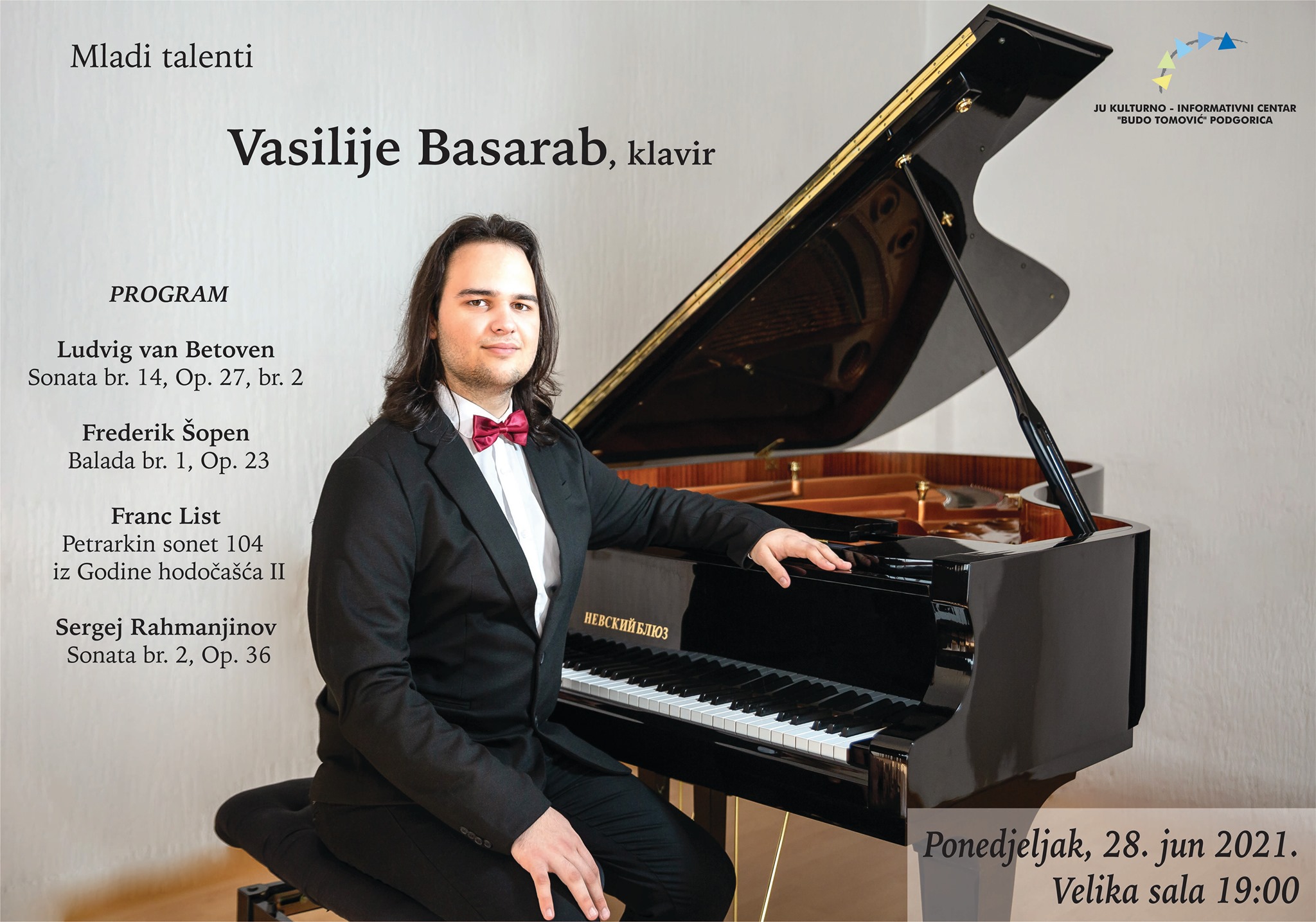 Solistički koncert pijaniste Vaslija Basaraba biće održan u okviru KIC-ovog ciklusa “Mladi talenti” koji ima za cilj afirmisanje talentovanih i perspektivnh umjetnika.