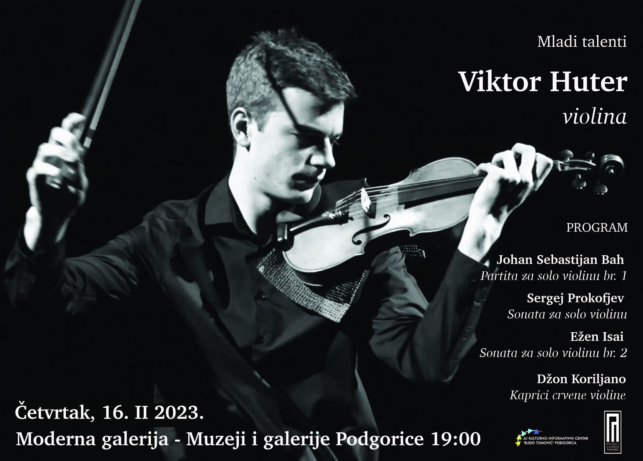 Solistički koncert mladog crnogorskog violiniste Viktora Hutera biće održan u okviru KIC-ovog ciklusa “Mladi talenti” u četvrtak, 16.februara, u Modernoj galeriji Muzeja i galerija Podgorice u 19 sati.
