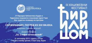 U neđelju, 8. septembra na programu III književnog festivala „Ćirilicom“ od 21 čas na Trgu između crkava biće održano predavanje akademika Siniše Jelušića na temu „Solženjicin, pogled iz 21. vijeka“. Aleksandar Solženjicin, pisac, politički mislilac i disident, po sudu mnogih, jedan je od naznačajnijih ruskih i svjetskih pisaca prošlog vijeka.