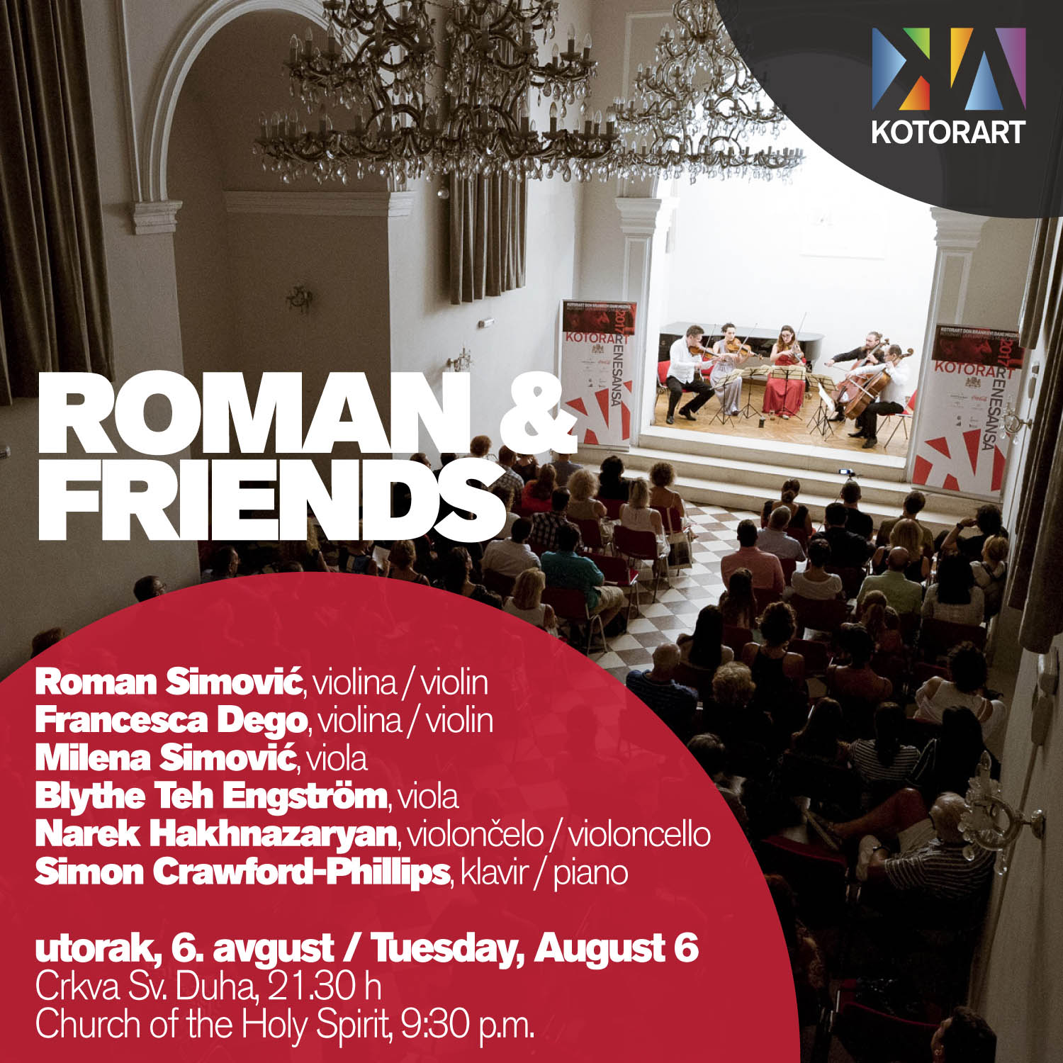 Koncertmajstor jednog od najcjenjenijih orkestara današnjice, Londonskog simfonijskog orkestra, naš najpoznatiji violinista, Roman Simović, koji je svojom briljantnom virtuoznošću i urođenom muzikalnošću osvojio najznačajnije svjetske scene, i ove godine na KotorArt Don Brankove dane muzike dovodi vrhunske umjetnike. U utorak, 6. avgusta, u Crkvi Sv. Duha, s početkom u 21.30h, Simović će nastupiti s koleginicom Frančeskom Degoom, violistkinjama Milenom Simović i Blajt Teh-Engstrem, violončelistom Narekom Hahnazarjanom i pijanistom Sajmonom Kroford-Filipsom. Dva kapitalna djela kamerne muzike, Klavirski kvintet Sezara Franka i Klavirski kvartet Johanesa Bramsa, biće i više nego dovoljan zvučni prostor da umjetnici iskažu svoje kvalitete.