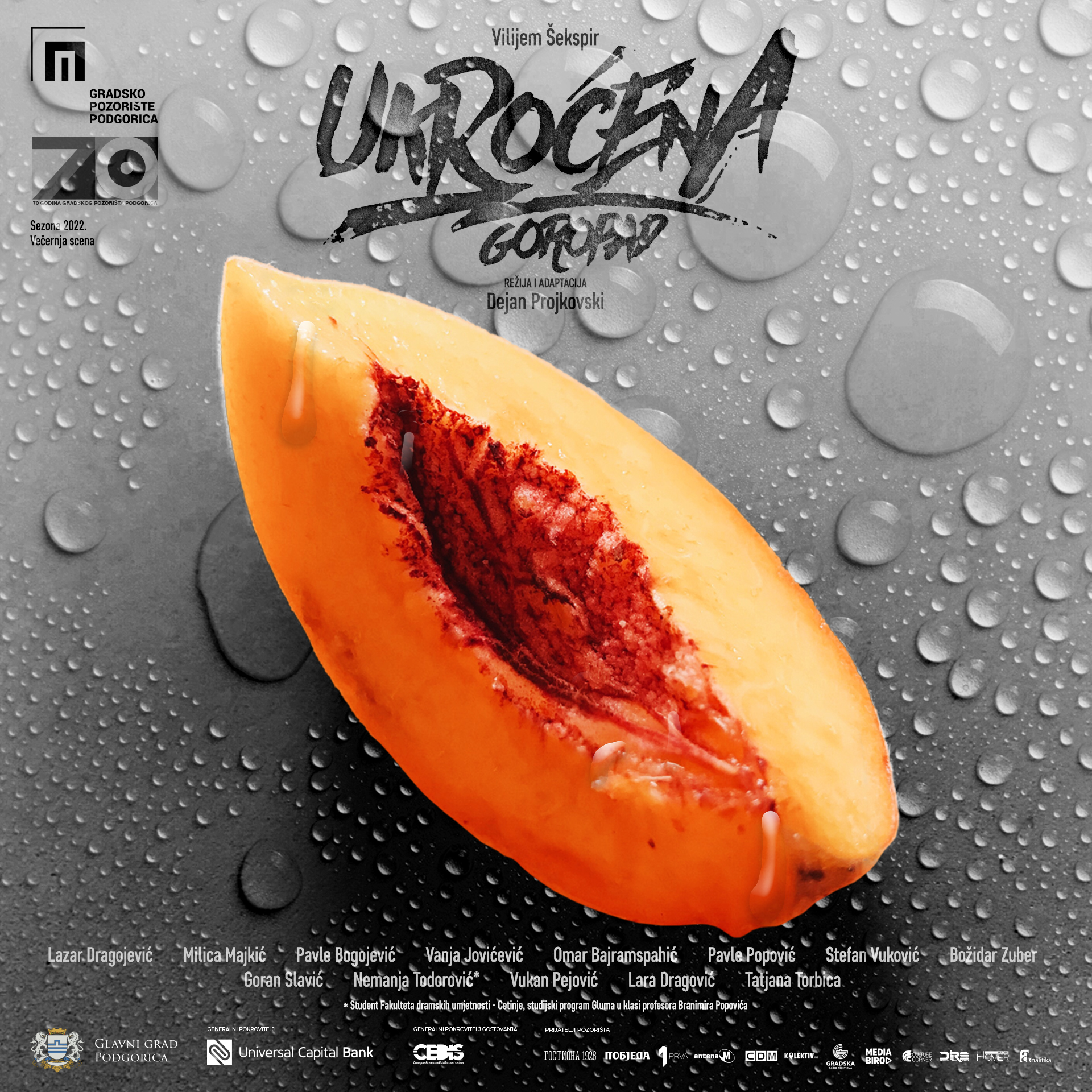 Komad je režirao i adaptirao poznati makedonski i evropski reditelj Dejan Projkovski, dramaturgiju potpisuje Dragana Tripković, scenografiju Valentin Svetozarev, muziku Goran Trajkoski, kostimografiju Katarina Vukčević, scenski pokret i koreografiju Tamara Vujošević Mandić, a lekturu Radovan Knežević. Uloge tumače Lazar Dragojević, Milica Majkić, Pavle Bogojević, Vanja Jovićević, Omar Bajramspahić, Pavle Popović, Stefan Vuković, Božidar Zuber, Goran Slavić, Nemanja Todorović, Vukan Pejović, Lara Dragović i Tatjana Torbica.